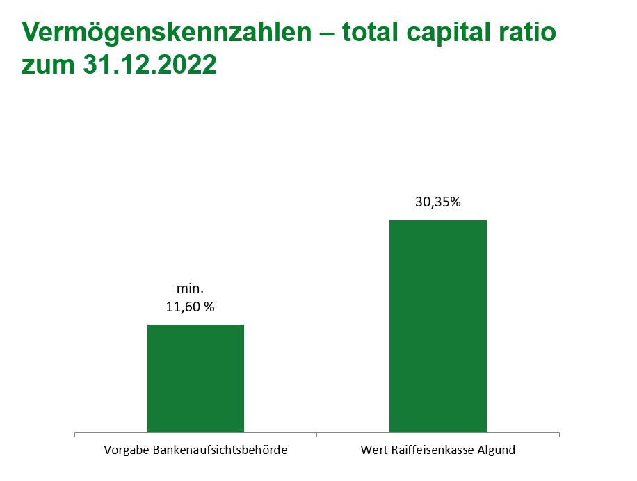 Die Raiffeisenkasse Algund verfügt über eine Gesamtkapitalquote (Total Capital Ratio - TCR) von 30,35% und liegt damit weit über dem nationalen Durchschnitt.
