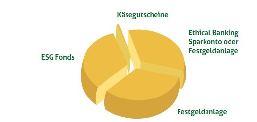 Enthalten ist ein Ethical Banking Sparprodukt. Sie entscheiden selbst, welches Projekt aus 7 Spar- und Finanzierungslinien wir mit ihrem Geld unterstützen. Durch Verzicht auf die höchstmögliche Rendite können Sie den Förderzins für den von uns vergebenen Kredit direkt beeinflussen. Ein weiterer Teil besteht aus einer Festgeldanlage, bei der es nicht schwer fällt, ein gutes Gefühl zu haben: Ihr Geld liegt in den Händen einer soliden Genossenschaftsbank, die den Raiffeisen-Prinzipien folgt und sich der örtlichen Gemeinschaft verpflichtet hat. Ebenfalls enthalten ist ein ESG Fonds. Beim vierten Teil wird es ganz konkret: Sie erwerben Käsegutscheine, der Hofkäserei Englhorn aus Schleis.