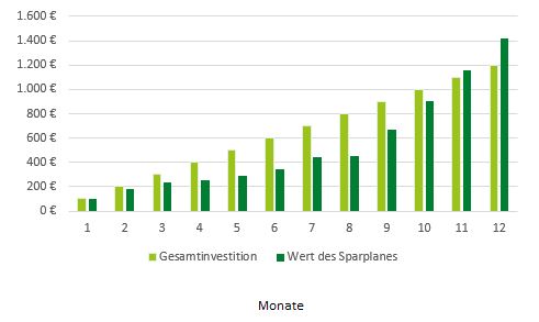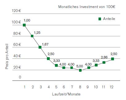 Der Anleger zahlt monatlich 100 Euro in seinen Fonds- Sparplan ein. Sinkt der Preis des Fonds, erwirbt der Anleger mehr Fondsanteile. Steigt der Preis des Fonds auch nur leicht wieder an, so profitiert der Kunde von den vorangegangenen niedrigen Kaufpreisen und der Gesamtwert des Sparplans steigt.