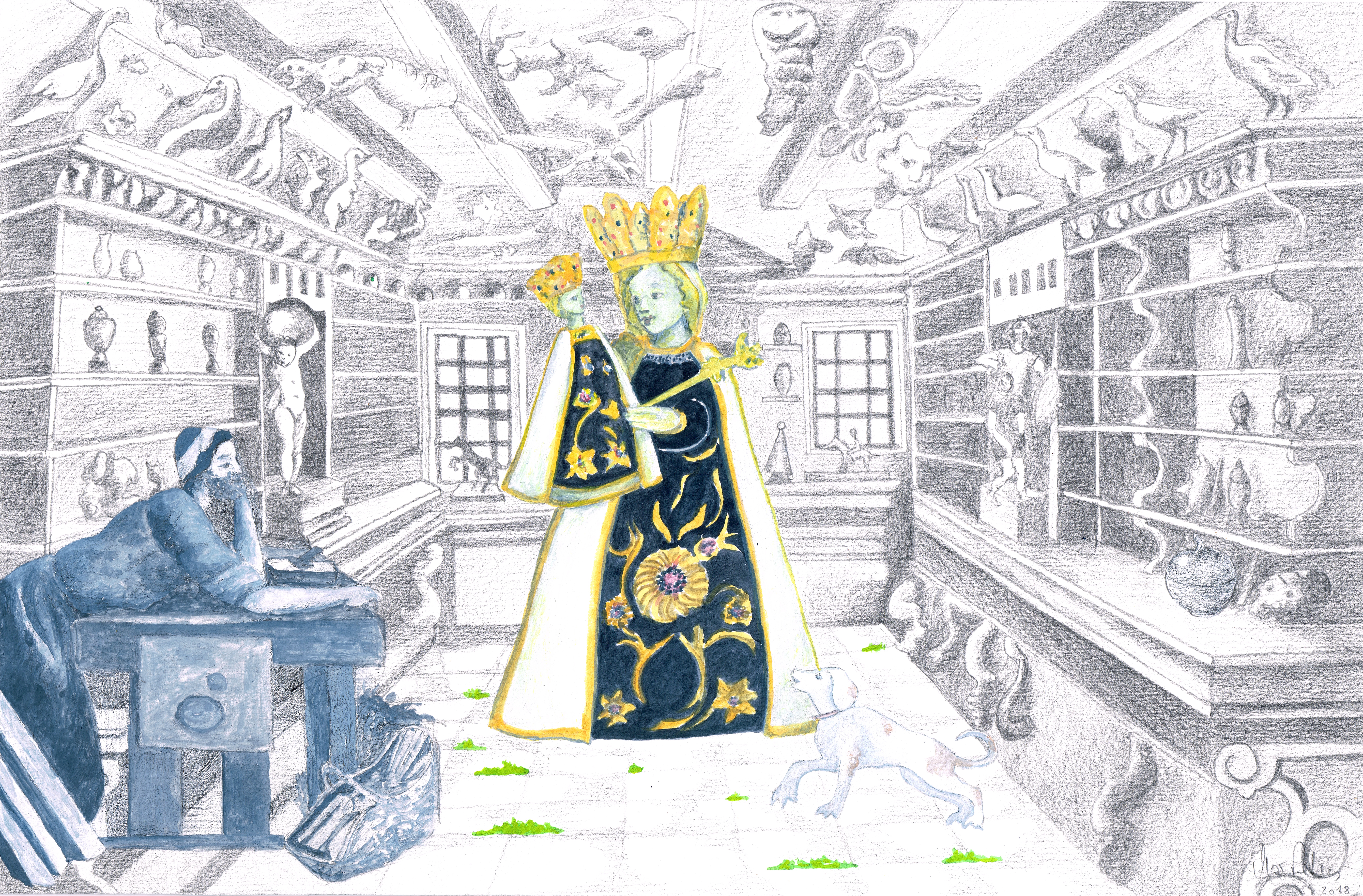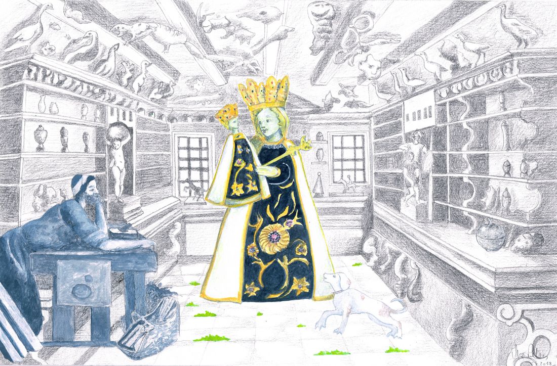 Maria Peter liebt es, in ihren Bildern unterschiedliche Motive zu kombinieren um damit Geschichte zu erzählen. Für die Gestaltung der Weihnachtskarte 2018 versetzt sie die Madonna aus Altötting in eine Wunderkammer des 16. Jahrhunderts.