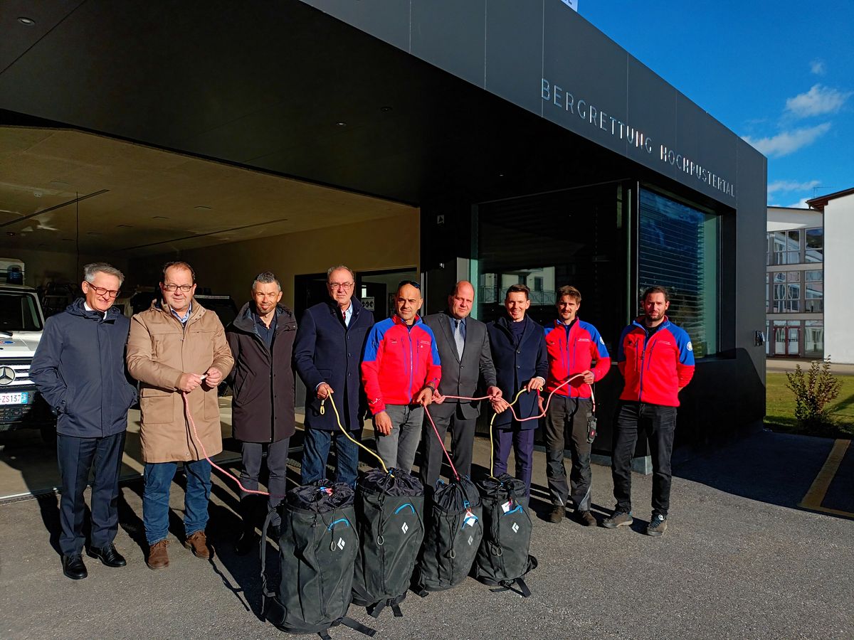 Die Vertreter der Raiffeisenkassen Niederdorf, Toblach und Welsberg-Gsies-Taisten bei der Seilübergabe an die Bergrettung Hochpustertal im Rahmen der ICAR.