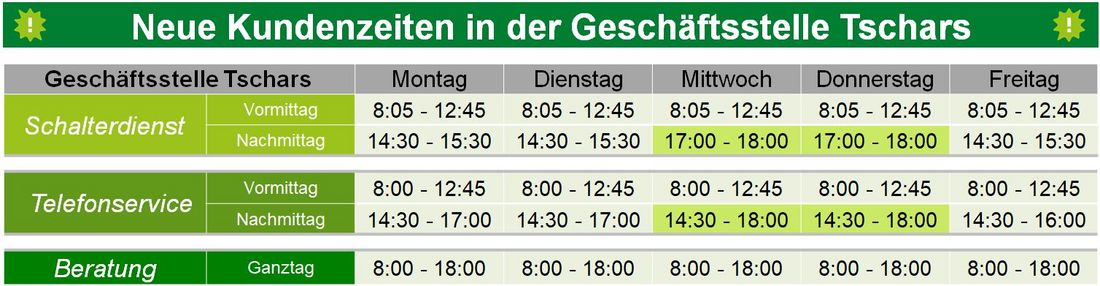 NEU: Wir haben die Vormittags-Öffnungszeiten erweitert und sind nun bis 12:45 Uhr für Schalterdienste geöffnet. Die Tscharser Kunden äußerten des Öfteren den Wunsch nach unterschiedlichen Schalteröffnungszeiten. Diesem Wunsch sind wir nachgekommen und haben nun zwei Abendöffnungszeiten eingeführt. Somit sind wir am Mittwoch und am Donnerstag in der Geschäftsstelle Tschars von 17:00 bis 18:00 Uhr für Schalterdienste geöffnet.
