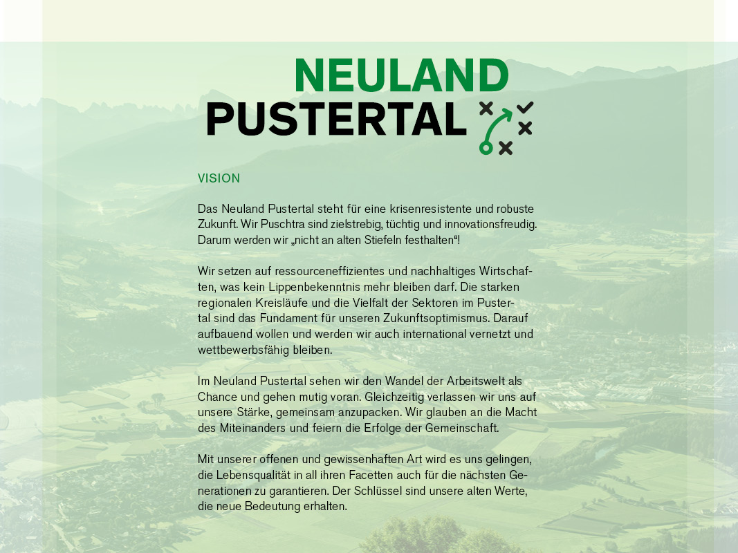 Wir waren und sind uns sicher: Die Folgen der Corona-Krise werden für jene Unternehmen am ehesten zu bewältigen sein, die mit Zukunftsmut, Innovationsgeist und mit einer starken Vision vorangehen. So haben wir uns als ersten Schritt im "NEULAND Pustertal" gemeinsam mit Kunden, Unternehmern, Arbeitnehmern, Sozialpartnern und politischen Vertretern auf eine spannende Expedition gemacht und uns die Zukunftsfrage gestellt, um zu einer richtungsweisenden Antwort zu gelangen: Welche ist die Vision der Pustertaler, mit der wir kraftvoll die Zeit nach der Krise angehen möchten?