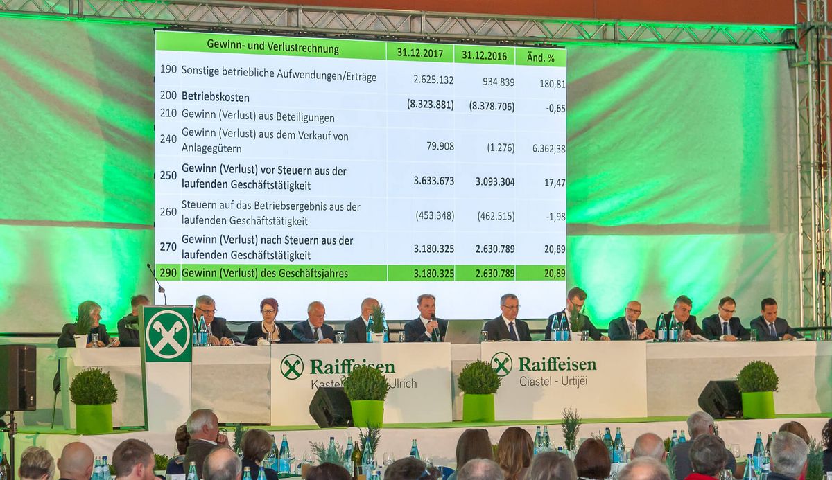 Die diesjährige Vollversammlung der Raiffeisenkasse Kastelruth-St. Ulrich fand Ende Mai im Sportzentrum in Telfen statt. Fast 600 Mitglieder waren gekommen um den Jahresabschluss 2017 zu genehmigen und die Organe neu zu bestellen.