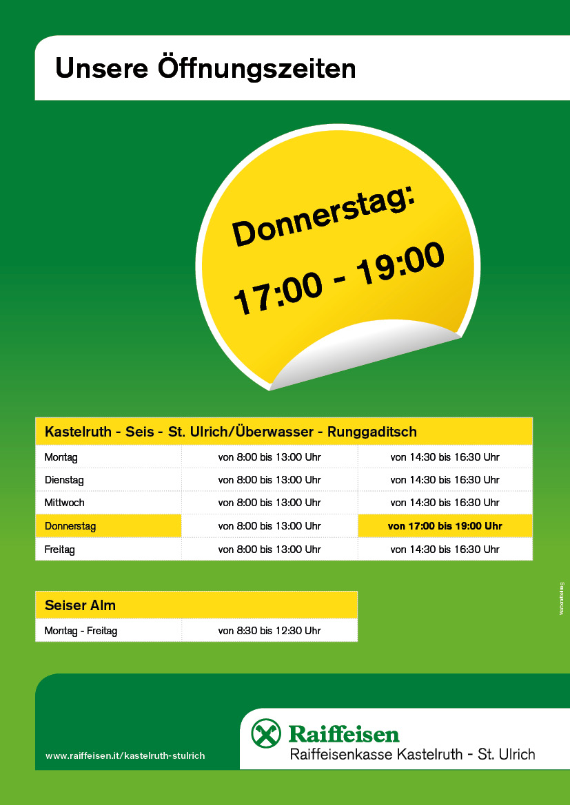Online steht Ihnen die Raiffeisenkasse rund um die Uhr unter www.raiffeisen.it/kastelruth-stulrich zur Verfügung.