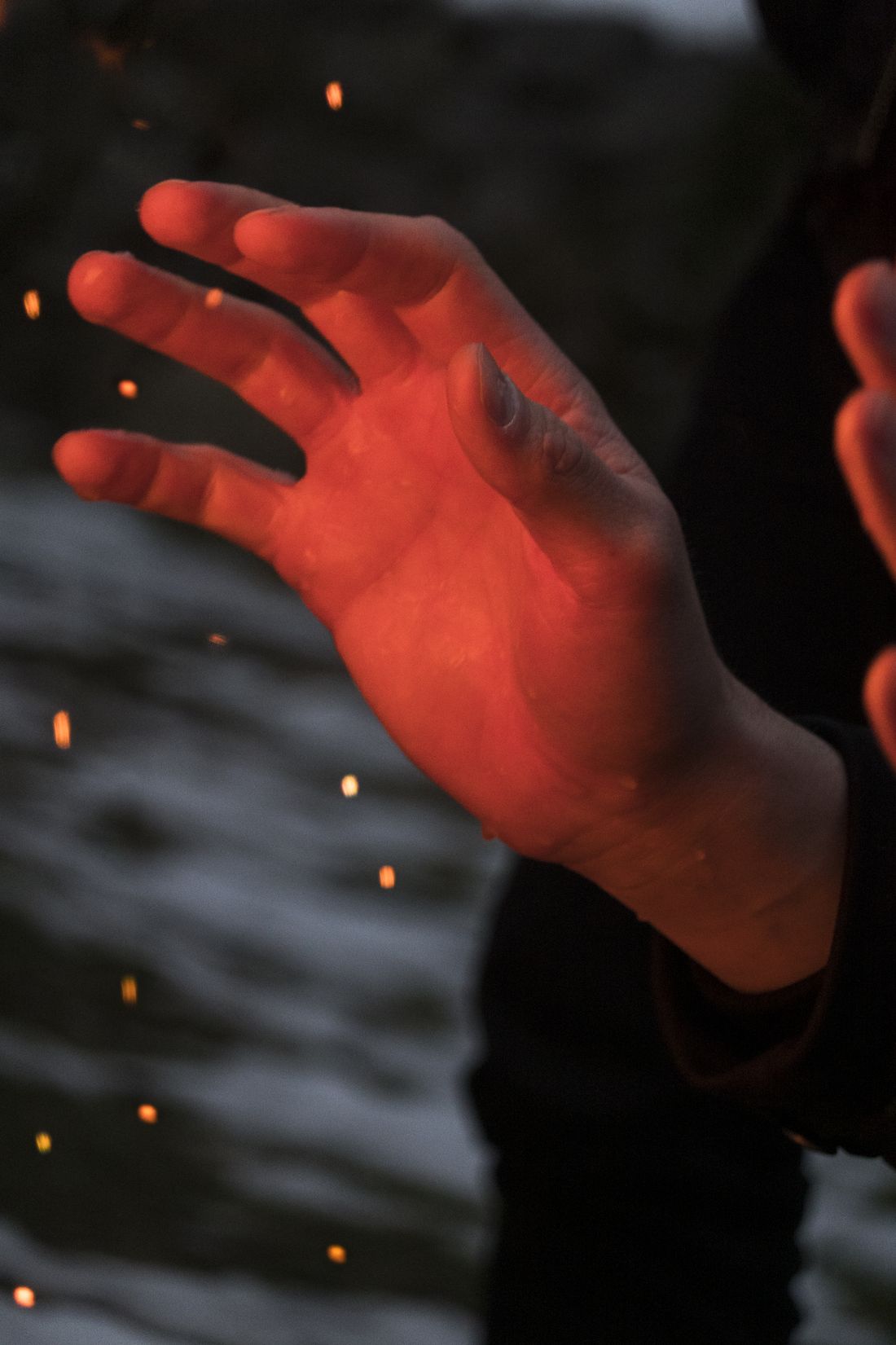 Beim Weihnachtsmotiv hat er sich für Hände, die sich an einem offenen Feuer wärmen, entschieden. Die frierenden Hände nähern sich der Wärmequelle, die sich außerhalb des Bildrandes befindet. Das wache Auge des Fotografen erkennt quasi intuitiv die wunderbare Ästhetik und Aussagekraft des Moments und fängt die beiden Gegenpole, Wärme und Kälte, auf seinem Foto ein. Die leicht gebeugten Finger der hell angeleuchteten Hand, umgeben von goldenen Glutpunkten, scheinen die Hitze des Feuers gleichsam greifen und an uns weitergeben zu wollen. Hände sprechen bekanntlich Bände.