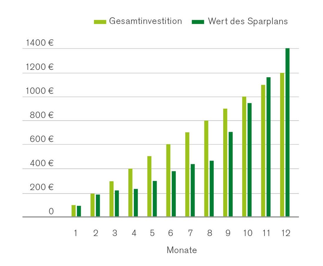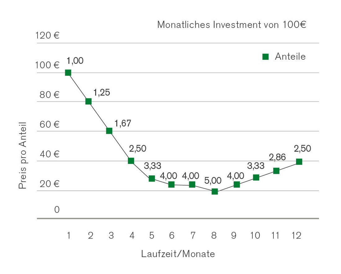 Der Anleger zahlt monatlich 100 Euro in seinen Fonds- Sparplan ein. Sinkt der Preis des Fonds, erwirbt der Anleger mehr Fondsanteile. Steigt der Preis des Fonds auch nur leicht wieder an, so profitiert der Kunde von den vorangegangenen niedrigen Kaufpreisen und der Gesamtwert des Sparplans steigt.